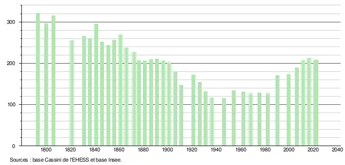 - ↑ Fiches Insee - Populations de référence de la commune pour les années 2006, 2007, 2008, 2009, 2010, 2011, 2012, 2013, 2014, 2015, 2016, 2017, 2018, 2019, 2020, 2021 et 2022.