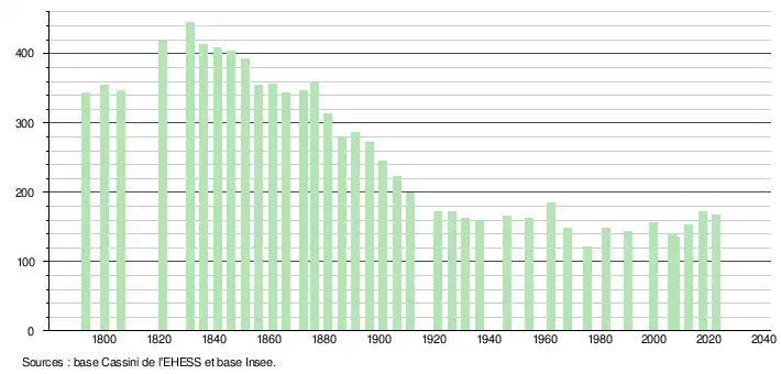 L'évolution du nombre d'habitants est connue à travers les recensements de la population effectués dans la commune depuis 1793. Pour les communes de moins de 10 000 habitants, une enquête de recensement portant sur toute la population est réalisée tous les cinq ans, les populations de référence des années intermédiaires étant quant à elles estimées par interpolation ou extrapolation[14]. Pour la commune, le premier recensement exhaustif entrant dans le cadre du nouveau dispositif a été réalisé en 2007[15].