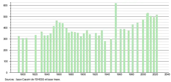 L'évolution du nombre d'habitants est connue à travers les recensements de la population effectués dans la commune depuis 1793. Pour les communes de moins de 10 000 habitants, une enquête de recensement portant sur toute la population est réalisée tous les cinq ans, les populations de référence des années intermédiaires étant quant à elles estimées par interpolation ou extrapolation[27]. Pour la commune, le premier recensement exhaustif entrant dans le cadre du nouveau dispositif a été réalisé en 2007[28].