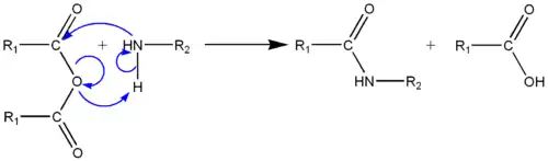 Une autre possibilité est de partir d'un anhydride d'acide (R-CO-O-CO-R) avec libération d'acide carboxylique, qui réagit avec un deuxième équivalent de l'amine. L'acide produit n'est pas assez réactif pour former un amide avec l'amine. Il est également possible d'utiliser l'acide carboxylique activé par un réactif de couplage peptidique, de faire réagir un acide carboxylique et une amine pour former un sel qui peut être converti en amide par déshydratation, ou de partir d'oximes comme dans le réarrangement de Beckmann.