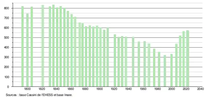 L'évolution du nombre d'habitants est connue à travers les recensements de la population effectués dans la commune depuis 1793. Pour les communes de moins de 10 000 habitants, une enquête de recensement portant sur toute la population est réalisée tous les cinq ans, les populations de référence des années intermédiaires étant quant à elles estimées par interpolation ou extrapolation[16]. Pour la commune, le premier recensement exhaustif entrant dans le cadre du nouveau dispositif a été réalisé en 2006[17].