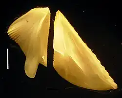 L’orifice est légèrement denté et le scutum présente des tries de croissance finement crénelées[6] mais n'est pas réticulé[7].