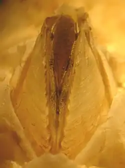 Les languettes tergo-scutales ont un fond blanc (piqueté de pourpre chez les adultes) traversé par cinq bandes noires [7].