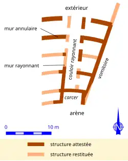 L'amphithéâtre, en forme d'ellipse régulière et bâti sur structure creuse, mesure environ 107 × 90 m[B 6]. L'arène est entourée d'une cavea se développant sur 20 m de large et comportant six murs annulaires dont l'épaisseur va de 0,60 à 0,90 m ; le mur intérieur est celui du podium, le mur extérieur est la paroi périphérique de l'amphithéâtre. Ces murs annulaires s'interrompent au niveau de murs rayonnants limitant des couloirs d'accès[13]. Dans cette configuration, la capacité de l'amphithéâtre est estimée à 6 000 spectateurs[B 8].