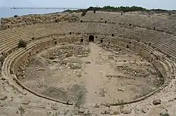 De rares amphithéâtres ne suivent pas le plan d'ensemble d'un édifice ellipsoïdal, comme celui de Leptis Magna. Cet édifice, intégralement creusé dans une ancienne carrière et inauguré en 56, donne l'impression d'être composé de deux théâtres accolés et son arène comme sa cavea ont la forme de deux demi-cercles reliés par de très courts segments de droite. Cette configuration lui aurait permis d'accueillir des spectacles d'un genre nouveau voulu par Néron, associant combats, démonstrations équestres et concours musicaux[G12 11].