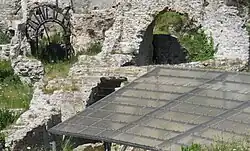 Du bâtiment adossé à la gauche de la Porta Pompae, la natatio, les sols (mosaïque en échiquier et figures de dauphins, opus spicatum et hexagones), une inscription en mosaïque et des restes de fresques sont visibles. Les vestiges de ce bâtiment sont protégés par une toiture moderne.