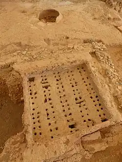 Ce sont toutes des tombes de très jeunes enfants, âgés au plus de 6 à 9 mois[15]. La première est découverte en 1985. Elle est d'une facture si inhabituelle qu'elle laisse penser qu'elle est unique[11] : c'est un coffrage de tuiles placé le long du mur sud du bâtiment no III construit pendant la phase 2 du site, des années 20 à 30 ap. J.-C.[16].