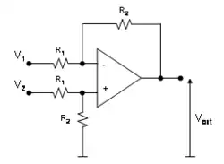 L'amplificateur différentiel classique est réalisé à partir d'un amplificateur opérationnel, utilisé en mode linéaire (contre réaction de la sortie sur son entrée négative, peut être aussi sur l'entrée positive suivant un autre schéma).