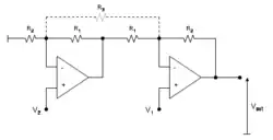 L'amplificateur d'instrumentation idéal devrait avoir un gain en mode commun nul (TRMC infini). En réalité, dans le circuit ci-contre, la valeur de ce gain est déterminée par les tolérances des valeurs des résistances qui rendent le schéma asymétrique, et par le gain de mode commun non nul des deux AOP utilisés. La réalisation de résistances appairées en valeur est la principale contrainte de fabrication des circuits d'instrumentation[9].
