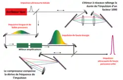 Dans l'amplification par dérive de fréquence, l'impulsion laser ultracourte initiale est étirée temporellement dans un système optique constitué d'éléments optiques dispersifs (réseaux de diffraction, prismes, bloc de silice…) disposés de sorte que les composantes à basse fréquence de l'impulsion (le "rouge") parcourent un chemin plus court que les composantes haute fréquence (le "bleu"). En sortie de cet étireur, l'impulsion laser possède une dérive de fréquence positive (ou chirp), et sa durée est rallongée d'un facteur 103 à 105. Son intensité est alors suffisamment faible pour être introduite dans les différents milieux à gain où elle est amplifiée d'un facteur 106 ou plus. L'impulsion amplifiée est finalement recomprimée à sa durée initiale par un procédé inverse à celui de l'étireur. Ainsi, dans le compresseur, qui comporte généralement deux réseaux de diffraction, les différentes composantes spectrales sont remises en phase pour produire l'impulsion laser la plus courte possible.