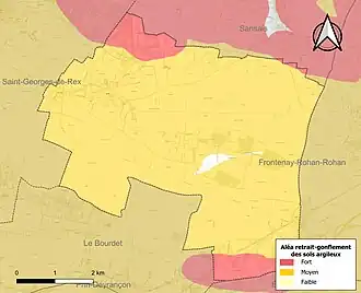 Les mouvements de terrains susceptibles de se produire sur la commune sont des tassements différentiels[16]. Le retrait-gonflement des sols argileux est susceptible d'engendrer des dommages importants aux bâtiments en cas d’alternance de périodes de sécheresse et de pluie[17]. 99,2 % de la superficie communale est en aléa moyen ou fort (54,9 % au niveau départemental et 48,5 % au niveau national)[Carte 2]. Depuis le , en application de la loi ELAN, différentes contraintes s'imposent aux vendeurs, maîtres d'ouvrages ou constructeurs de biens situés dans une zone classée en aléa moyen ou fort[Note 2],[18].