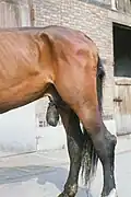 - La phase d'état comporte une aggravation des symptômes généraux (abattement plus marqué, etc.) et oculaires (pétéchies plus nombreuses), et la formation de pétéchies sur la muqueuse buccale et la face inférieure de la langue. Certains chevaux présentent en outre, isolés ou associés, des symptômes d'atteinte hépato-rénale (polyurie, albuminurie), une diarrhée fétide, striée de sang, avec de légères coliques, des symptômes de myocardite et des œdèmes déclives (photo).