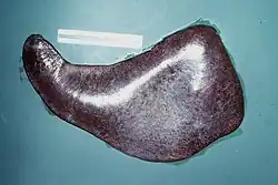 - Dans les formes aiguës, outre l'émaciation musculaire, les œdèmes sous-cutanés en partie déclive, l'hypertrophie des nœuds lymphatiques, des lésions de néphrite (reins pâles et hypertrophiés), on note trois lésions essentielles, mais inconstantes : une myocardite (myocarde couleur feuille morte, tigré à la coupe et friable, avec pétéchies), une hépatomégalie (foie couleur feuille morte, friable, pesant parfois 10 à 20 kg) et une splénomégalie (rate ferme, bosselée, pesant parfois 4 à 8 kg) (photo). Présence d'hémorragies intestinales.