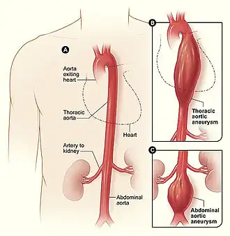 Il s'agit d'une dilatation du calibre de l'artère. Il peut intéresser tout segment de l'aorte. La localisation la plus fréquente se situe en dessous des artères rénales, c'est-à-dire dans la dernière portion de l'aorte. On parle alors d'anévrisme de l'aorte abdominale. Une autre localisation est l'anévrisme de l'aorte ascendante, située au niveau du thorax et comportant certaines spécificités.