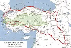 Désormais seuls en pays hostile, les Dix-Mille tentent de négocier avec Artaxerxès II et son intermédiaire le satrape Tissapherne. Ce dernier gagne la confiance des généraux grecs Cléarque et Mennon mais il leur tend un piège et les fait assassiner. Conduits par Xénophon, les Grecs réussissent à échapper aux troupes royales malgré leur manque de cavalerie. Ils rejoignent l'Arménie puis les côtes méridionales du Pont-Euxin à proximité de Trapézonte. Arrivés dans la région de l'Hellespont, ils s'engagent dans des luttes intestines entre Thraces.