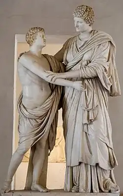 Les scènes d'anagnorisis du théâtre comportent elles aussi des conventions gestuelles (qu'on peut déduire des propos échangés) et surtout des exclamations récurrentes et formulaires, dont la plus fréquente est sans doute Ἔχω σε, « Je t'ai ! » (c'est-à-dire : « Tu es dans mes bras »), qui passe de la tragédie[51] à la comédie[52], puis au roman grec profane[53] et de là au roman chrétien que sont les Homélies pseudoclémentines[54]. Ces brèves exclamations pouvaient être, à l'occasion, prolongées dans des discours célébrant la puissance des sentiments familiaux. Vers la fin de l’Arbitrage de Ménandre, l'esclave Onésimos (v. 765-766) déclame deux vers de l’Augé (perdue)[55] d'Euripide (« Ainsi l'a voulu la nature, qui ne se soucie en rien des lois ; c'est même pour cela que la femme est naturellement constituée »), et menace plaisamment l'avide vieillard Smikrinès, qui ne veut pas croire que l'enfant soit celui de son fils et de sa bru, de lui réciter toute la tirade de l'héroïne (v. 767 : τραγικὴν ἐρῶ σοι ῥῆσιν ἐξ Αὐγῆς ὅλην). Malheureusement pour nous, il ne met pas sa menace à exécution[56].