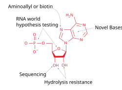 - La création d'une polymérase capable de synthétiser un (acide xénonucléique) (AXN). L'ARN polymérase T7 peut être utilisée comme modèle de départ[32].