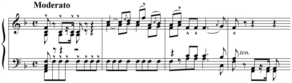 C’est la situation que l’on trouve au début de la Sonate en fa majeur, Hob. XVI:29, de Haydn, où la dominante (incomplète) apparaît à la fin de la mes. 3, tandis que le reste du fragment ne consiste qu’en arpèges (avec broderies) de l’accord de fa :