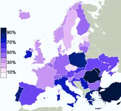 - L'Eurobaromètre d'Eurostat établit, en 2005, que 52 % des citoyens européens ont répondu qu'ils croient qu'il y a un Dieu, tandis que 27 % ont répondu qu'ils croient qu'il y a une certaine sorte d'esprit ou de force de la vie, et 18 % qu'ils ne croient pas qu'il y ait un esprit, ni de Dieu, ni de force de la vie et les résultats varient entre différents pays.
