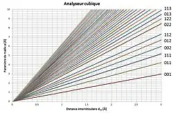 Le principe de l’analyseur cubique repose sur le fait que les trois paramètres de maille du cristal cubique sont égaux : ==. Cette particularité permet de simplifier l’équation de la distance interréticulaire, la distance entre deux plans d’indices de Miller (hkl), sous la forme suivante :