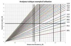 L’analyseur cubique est un outil graphique permettant d’estimer la valeur du paramètre de maille d’un cristal ayant un réseau de Bravais cubique et de déterminer les indices de Miller des plans diffractés. La technique de l’analyseur cubique utilise un graphique mettant en relation le paramètre de maille et la distance interréticulaire dhkl. Cet outil permet une analyse rapide d’un cliché de diffraction par rayons X.