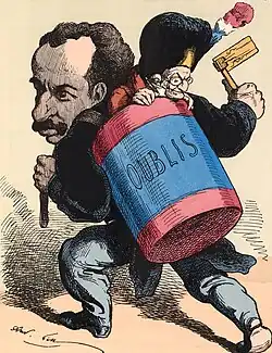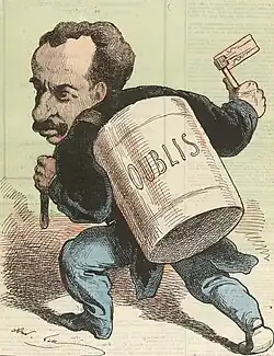 En , une charge d'André Gill représentant le député Choiseul en marchand d'oublis, portant Adolphe Thiers dans sa hotte, n'est acceptée par la censure qu'à la condition du retrait de ce dernier. L'Éclipse publie néanmoins cette version tronquée au point de devenir énigmatique, accompagnée d'un commentaire de Bienvenu qui désigne la censure sous le nom d'Anastasie Fulbert[63], vraisemblablement par référence au chanoine responsable de la castration d'Abélard[64]. Un an plus tard, en , le même journaliste donne à Anastasie, dans le journal satirique Le Trombinoscope, une autre parentèle : « Elle est fille naturelle de Séraphine Inquisition et compte de nos jours dans sa nombreuse famille quelques autres personnages également connus : Ernest Communiqué […], Zoé Bonvouloir, vicomte Butor de Saint-Arbitraire et Agathe Estampille, ses cousines, tante et beau-frère[65]. »