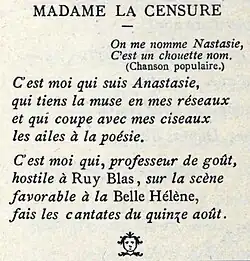 Issu du répertoire du café-concert, ce « nom de couturière » a été, selon Odile Krakovitch, pour la première fois utilisé pour désigner la censure au théâtre durant les années 1860[48]. Une brève de L'Éclipse en 1868 et un article du Gaulois en 1889 confère à Albert Wolff la paternité de ce « spirituel surnom » de la censure théâtrale[49],[50]. Après la parution en mars 1868, dans le quotidien pro-gouvernemental Le Pays, d'un article blâmant la torpeur du public hébété par les fééries et les opérettes, telle La Belle Hélène, qui serait désormais incapable de s'émouvoir pour Ruy Blas[51], Wolff répond dans le journal d'opposition Le Figaro que le théâtre d'Hugo est censuré et que reprocher au public l'effet de la censure a aussi peu de sens qu'aurait le comportement d'un homme qui giflerait le premier venu au motif que sa propre épouse, Anastasie, lui aurait fait une scène le matin même, ajoutant que, dans cette métaphore, « Anastasie au théâtre c'est la censure »[52]. Une semaine plus tard, un nouvel article du Figaro reprend la métaphore en précisant en note au lecteur que « Anastasie c'est la censure » et en affirmant que cet emploi du prénom est « désormais impérissable »[53]. Nonobstant, trois mois plus tard, la référence à Anastasie est reprise dans un épigramme publié anonymement par une petite revue littéraire, La Nouvelle Némésis[54]. Si les références à Ruy Blas et à La Belle Hélène sont toujours présentes, celle à l'épouse d'un passant colérique a disparu, remplacée par l'évocation de Nastasie, la couturière du café-concert (voir ci-contre). Une dizaine d'années plus tard, ce contexte oublié, l'explication du choix d'Anastasie s'en trouve simplifiée : « uniquement parce que ce prénom a cours dans les vaudevilles et qu'on est accoutumé à en rire »[55].