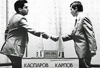 D' à , à Moscou, Anatoli Karpov rencontra pour la première fois son challenger Garry Kasparov dans un match marathon pour le championnat du monde 1984. Comme précédemment, le titre revenait au joueur ayant obtenu six victoires, les parties nulles ne comptant pas.