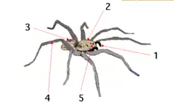 Les deux premières paires de pattes antérieures sont dites tractives et les deux paires postérieure sont dites pulsives. La majorité des familles des araignées ont les deux premières paires tournées vers l'avant (implantation prograde des pattes) alors que chez quelques familles anciennes, les quatre paires sont déployées sur le côté (implantation latérigrade des pattes), ce qui leur permet de courir sur le côté et en arrière, comme les crabes (plusieurs familles étant désignées par le nom vernaculaire d'araignées-crabes)[17],[18]. La présence de griffes permet aux araignées de grimper sur des surfaces rugueuses verticales (feuilles, rochers, volets de fenêtres, murs, plafonds, poutres). L'adhésion sur des surfaces lisses (fenêtre, évier) est assurée par des scopulae, touffes denses de soies qui permettent également aux araignées d'assurer une meilleure prise sur les proies glissantes, et de soulever jusqu'à 160 fois le poids de leur corps[19].