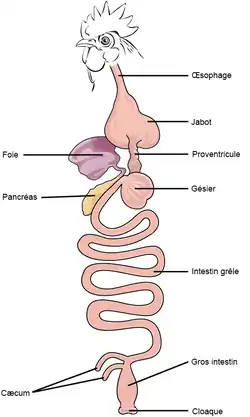 L'appareil digestif des oiseaux présente le même schéma de base que les autres vertébrés, mais peut présenter certaines particularités, comme un estomac en deux parties distinctes, ou la présence d'un œsophage dilaté chez de nombreuses espèces.