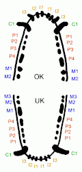 Les incisives centrales sont appelées « pinces », les deux suivantes « mitoyennes », les dernières latérales nommées « coins ». Les canines sont également appelées crocs.