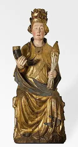 - Châsse de sainte Ursule, une chapelle miniature dorée à la feuille d’or dans laquelle sont insérés six panneaux illustrant la légende de sainte Ursule, (1489), 87 × 33 × 91 cm,