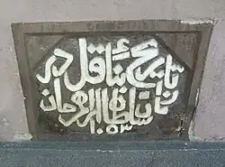 Sur le côté droit de la zone d'entrée, il y a une inscription turque du XVIIe siècle [1]. L'inscription, qui a été reprise dans le mur de l'hôtel de ville, traite de la construction d'une tour, mais a été incorrectement traduite en roumain comme suit : La construction de ce bain tombe à l'époque terrible d'Ibrahim Ehan, Heds 1053 [2].