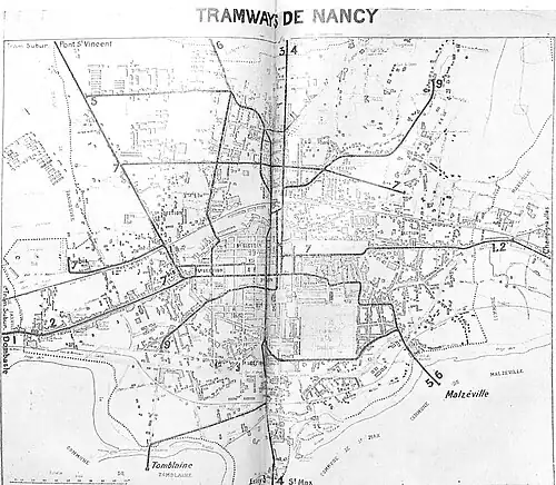 Schéma du réseau de tramway de Nancy, vers 1923 | ||