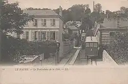 Déclaré d'utilité publique le 23 avril 1889[36], ouvert à l'exploitation le 17 août 1890[36], ce chemin de fer, long de 343 m dont 145 m en viaduc, était desservi par 2 voitures offrant 48 places et effectuant le trajet en 3 minutes[37]. En 1911, face au succès populaire (600 000 personnes l'empruntaient chaque année) et financier de l'entreprise[37], il fut décidé de remplacer la traction vapeur par la traction électrique. L'entre-deux-guerres confirma cette réussite, c'était alors plus de 2 millions de voyageurs qui étaient annuellement véhiculés dans des voitures de plus forte capacité[36]. Indispensable à la population locale, le funiculaire fut, à partir du 25 juillet 1945, exploité directement par la ville[38] qui décida sa modernisation à la fin des années 1960. Après de longs travaux menés entre 1968 et 1972, un funiculaire moderne fut mis à la disposition des Havrais[39]. De nouvelles voitures montées sur deux essieux avec roues sur pneumatiques roulant dans des profilés en U[36] ont repris le service pour le plus grand bonheur des écoliers, principaux utilisateurs de ce mode de transport, si peu répandu dans le nord du pays. En 2021, le funiculaire du Havre est entièrement rénové et recarrossé.