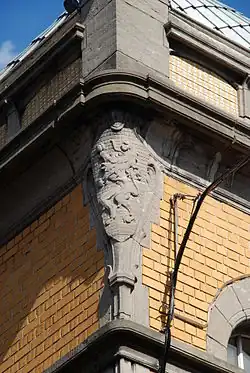 La façade se termine par une corniche courbe en pierre bleue dont l'angle est orné du blason de la commune, figurant un lion dressé.