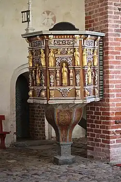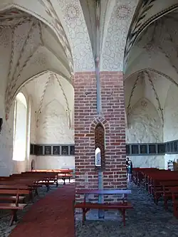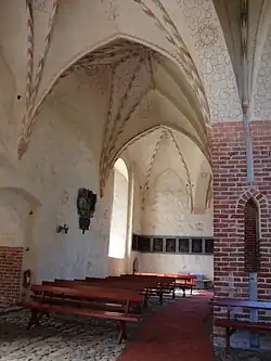 Le sol est pavé de pierres. Les peintures à la chaux des voûtes se composent de diverses boucles de feuilles et de motifs et de personnages primitifs. La chaire et les trois armoiries funéraires datent du XVIIe siècle[2].