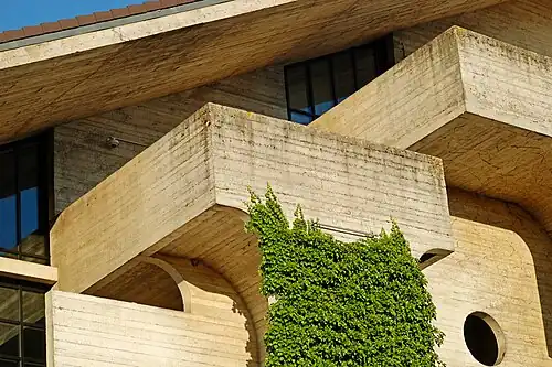 L'aspect « béton brut de décoffrage » typique du brutalisme est très visible sur toute la façade, et particulièrement au niveau des balcons.