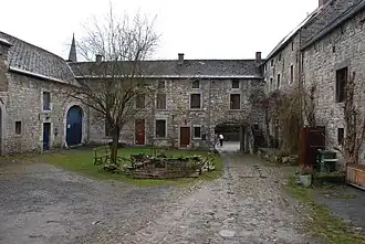 Les bâtiments élevés principalement en pierre calcaire et en grès sont disposés en U formant une cour rectangulaire jadis fermée d'environ 600 m2 (environ 36 m x 17 m). La rue de la Justice pénétrant dans la cour ainsi que les trottoirs placés au pied des façades ont été réalisés en pierres et galets provenant de l'Ourthe toute proche. L'aile sud-est se compose de plusieurs granges comprenant trois portes charretières avec arcs en plein cintre dont celle de gauche est datée de 1799. Le côté sud-ouest possède un arvô (passage voûté) avec arc en anse de panier du côté de la cour. L'aile nord-ouest comprend le corps de logis haut de deux niveaux et demi sur caves hautes. On y accède par un perron de huit marches. La façade longeant la rue du Ruisseau possède une tour semi-circulaire en brique d'un niveau placée à droite du porche d'entrée ainsi qu'une tour d'angle circulaire de deux niveaux en pierre calcaire avec toiture d'ardoises à six pans érigée au sud du bâtiment.