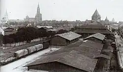 L'ancienne gare (à droite) et l'ancienne synagogue vers 1900. | |