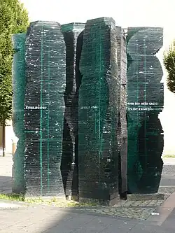 - ↑ Texte en allemand : Am 9.November 1938 haben Nationalsozialisten die Synagoge der Jüdischen Gemeinde zu Aachen, hier an dieser Stelle, durch Brandstiftung zerstört. Das Gebäude trug die Inschrift: “Mein Haus soll ein Bethaus für alle Völker sein” (Jesaja 56,7)
