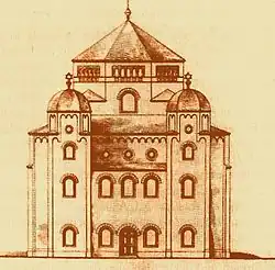 Le bâtiment central est construit sur un plan carré de vingt mètres par vingt mètres. Au-dessus de la pièce centrale du bâtiment central, s'élève un tambour octogonal couronné d'un toit à plusieurs versants. Sur le côté ouest, légèrement en retrait, et flanqué de deux tours octogonales avec coupoles à pans voutés, se trouve le vestibule servant d'entrée. La façade est divisée verticalement par des pilastres ou plutôt des contreforts. Les portails et les fenêtres à arc plein-cintre sont conçues dans le style historicisme. La corniche sous le toit est agrémentée d'une frise à arc plein-cintre de style néoroman[4].
