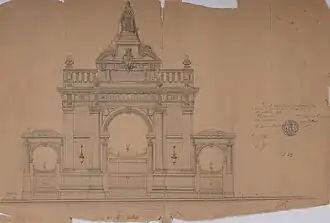 Celui-ci était composé de rampants couronnés d’une cimaise. Au centre une sculpture monumentale en galvanoplastie était érigée tout en haut de l’édifice. La sculpture représentait Cérès, déesse de l’Abondance et de la Prospérité, sculpté par Louis Samain[3].