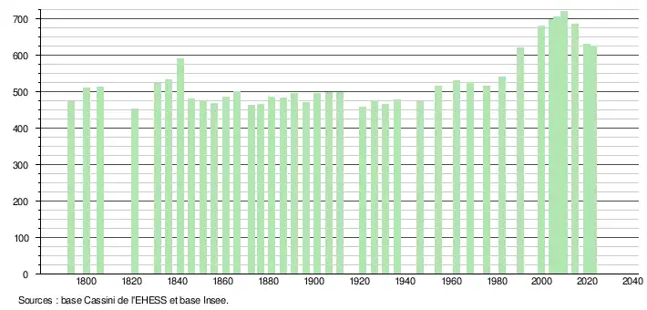 L'évolution du nombre d'habitants est connue à travers les recensements de la population effectués dans la commune depuis 1793. Pour les communes de moins de 10 000 habitants, une enquête de recensement portant sur toute la population est réalisée tous les cinq ans, les populations de référence des années intermédiaires étant quant à elles estimées par interpolation ou extrapolation[23]. Pour la commune, le premier recensement exhaustif entrant dans le cadre du nouveau dispositif a été réalisé en 2004[24].