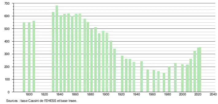 L'évolution du nombre d'habitants est connue à travers les recensements de la population effectués dans la commune depuis 1793. Pour les communes de moins de 10 000 habitants, une enquête de recensement portant sur toute la population est réalisée tous les cinq ans, les populations de référence des années intermédiaires étant quant à elles estimées par interpolation ou extrapolation[16]. Pour la commune, le premier recensement exhaustif entrant dans le cadre du nouveau dispositif a été réalisé en 2005[17].