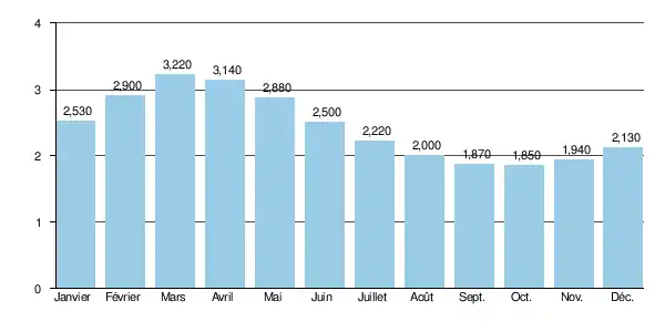 Sur cette courte période d'observation[note 8], le débit journalier maximal a été observé le pour 5,27 m3/s. Le débit instantané maximal a été observé le [note 9] avec 6,76 m3/s en même temps que la hauteur maximale instantanée de 947 mm soit 0,947 m[3].