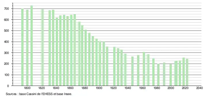 L'évolution du nombre d'habitants est connue à travers les recensements de la population effectués dans la commune depuis 1793. Pour les communes de moins de 10 000 habitants, une enquête de recensement portant sur toute la population est réalisée tous les cinq ans, les populations de référence des années intermédiaires étant quant à elles estimées par interpolation ou extrapolation[32]. Pour la commune, le premier recensement exhaustif entrant dans le cadre du nouveau dispositif a été réalisé en 2007[33].