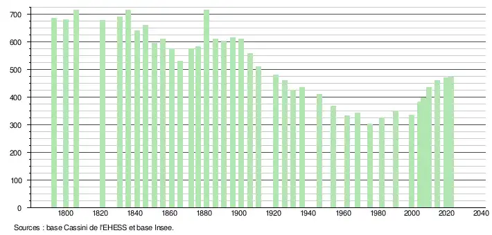 L'évolution du nombre d'habitants est connue à travers les recensements de la population effectués dans la commune depuis 1793. Pour les communes de moins de 10 000 habitants, une enquête de recensement portant sur toute la population est réalisée tous les cinq ans, les populations de référence des années intermédiaires étant quant à elles estimées par interpolation ou extrapolation[16]. Pour la commune, le premier recensement exhaustif entrant dans le cadre du nouveau dispositif a été réalisé en 2004[17].