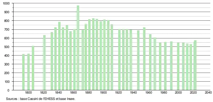 L'évolution du nombre d'habitants est connue à travers les recensements de la population effectués dans la commune depuis 1793. Pour les communes de moins de 10 000 habitants, une enquête de recensement portant sur toute la population est réalisée tous les cinq ans, les populations de référence des années intermédiaires étant quant à elles estimées par interpolation ou extrapolation[14]. Pour la commune, le premier recensement exhaustif entrant dans le cadre du nouveau dispositif a été réalisé en 2006[15].