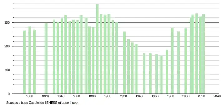 L'évolution du nombre d'habitants est connue à travers les recensements de la population effectués dans la commune depuis 1793. Pour les communes de moins de 10 000 habitants, une enquête de recensement portant sur toute la population est réalisée tous les cinq ans, les populations de référence des années intermédiaires étant quant à elles estimées par interpolation ou extrapolation[21]. Pour la commune, le premier recensement exhaustif entrant dans le cadre du nouveau dispositif a été réalisé en 2008[22].